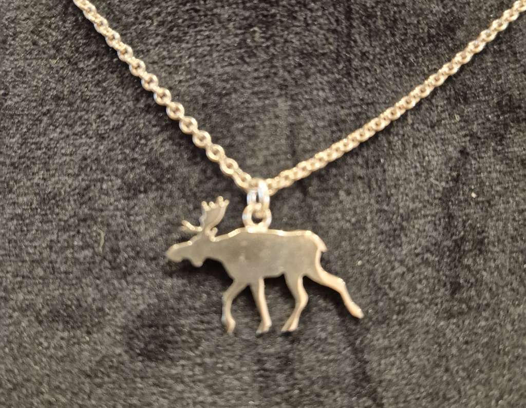 Sølvhalssmykke fra Janne Mari AS. Elg ca. 2 x 2,5 cm. Kjede 45 cm.