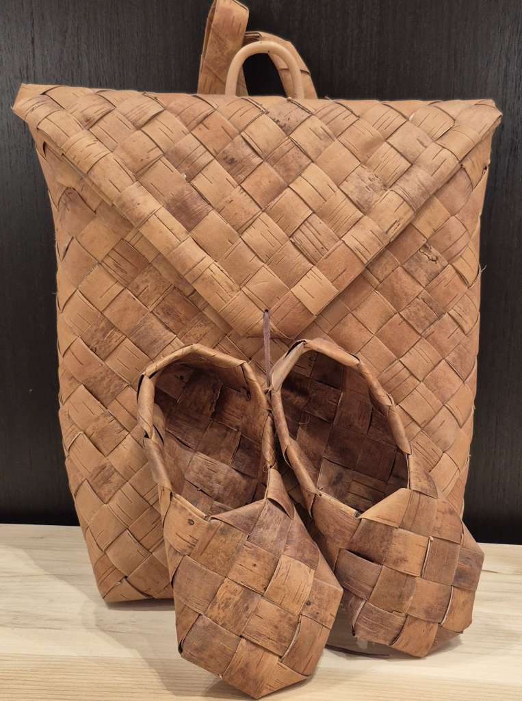 Kont m/sko. Flettet i never. Høyde 41 cm, bredde 39 cmSko: lengde 26 cm