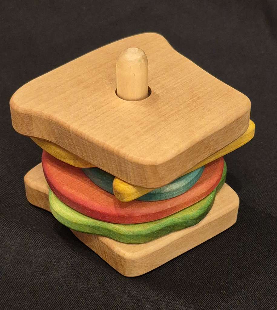 Håndlagde leker av Lillepomp. Lekene er farget med matfarger og oljet med produkter som er egnet for barneleker. De er derfor helt giftfrie og miljøvennlige.