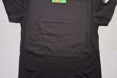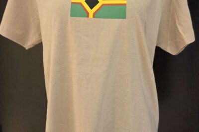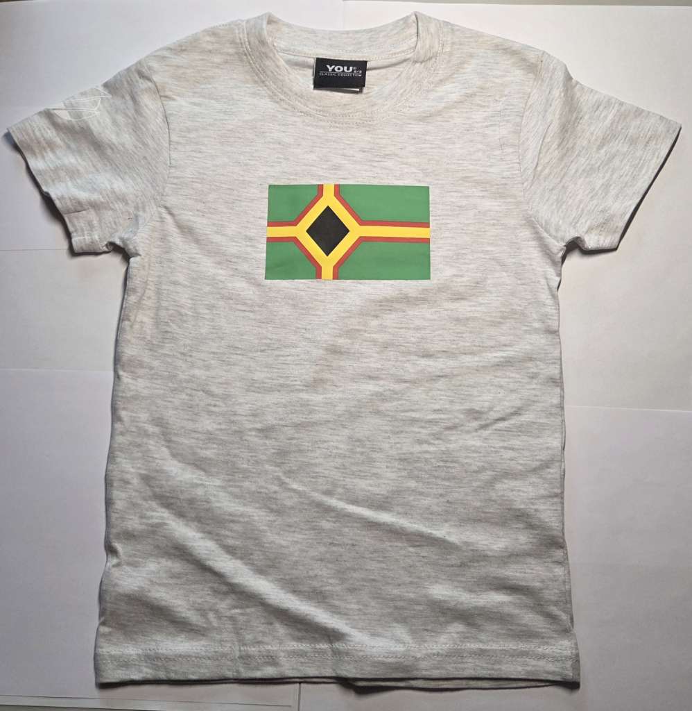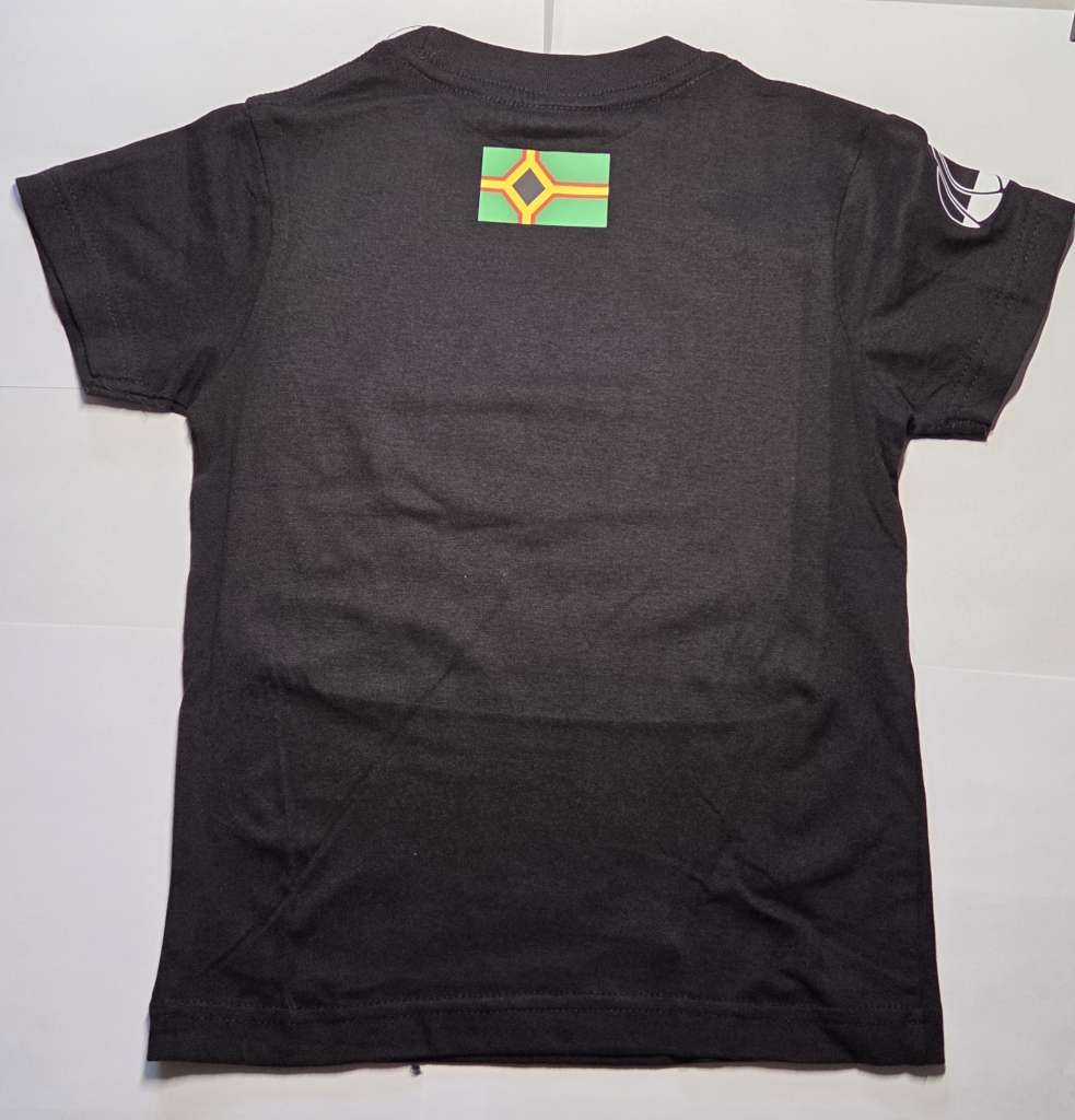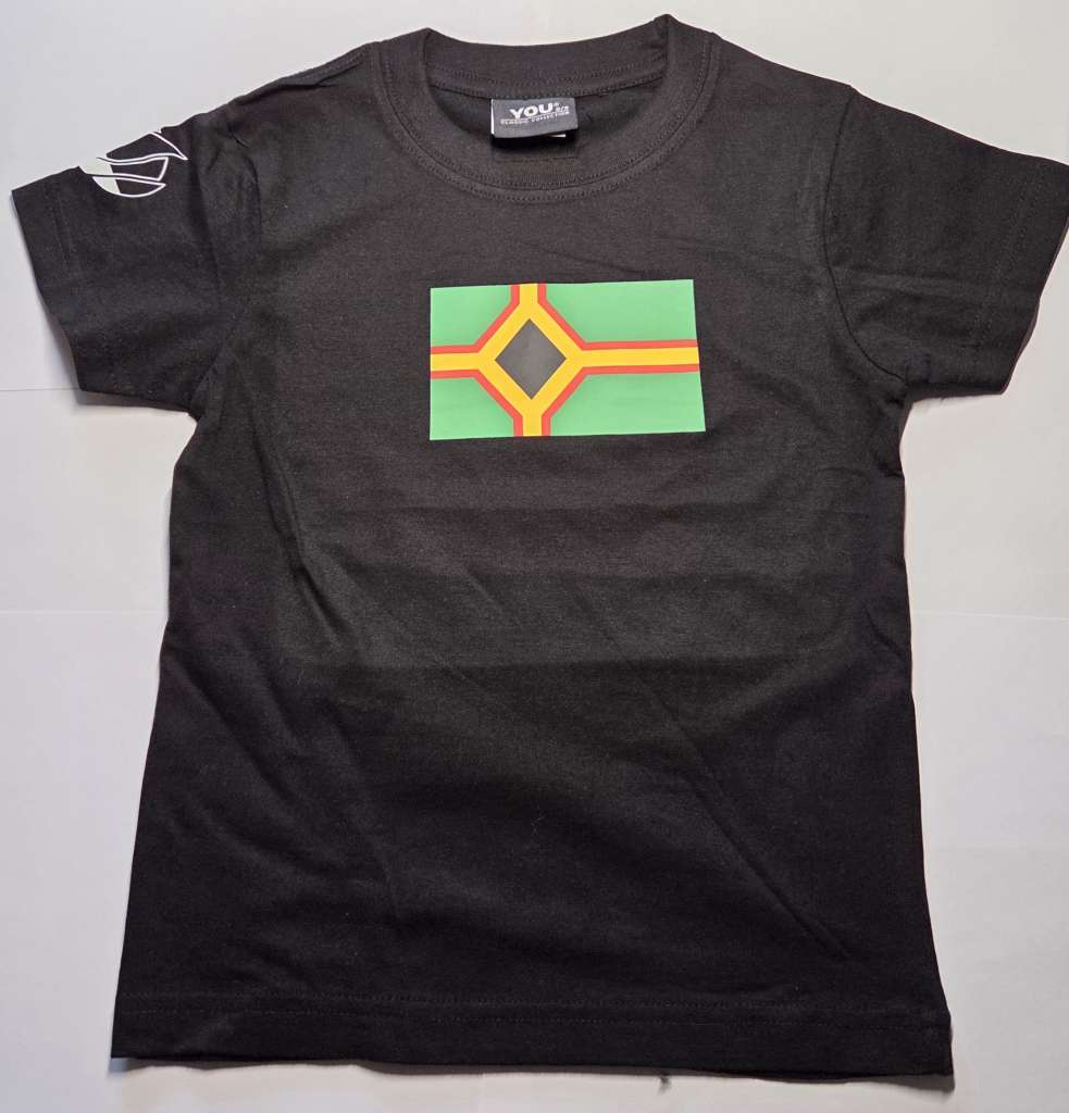T-skjorte i bomull med trykk av skogfinsk flagg på brystet og bak på rygg. Norsk skogfinsk museums logo på arm. Barn