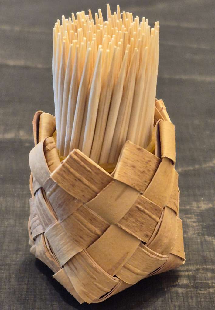 Tannpirkerholder flettet av never. Høyde ca 4,5 cm, diameter ca 3,5 cm
